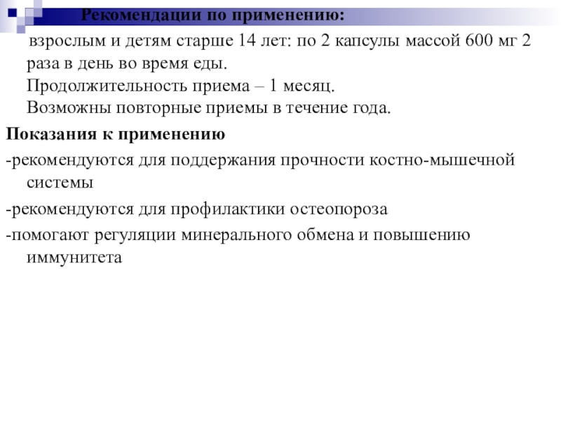 взрослым и детям старше 14 лет: по 2 капсулы массой 600 мг 2 раза в день во время еды.