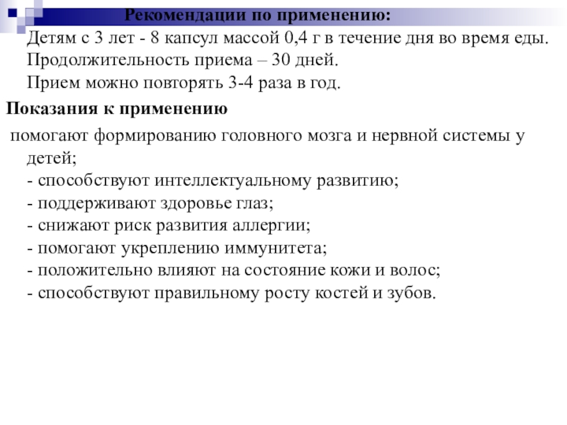 Детям c 3 лет - 8 капсул массой 0,4 г в течение дня во время еды.