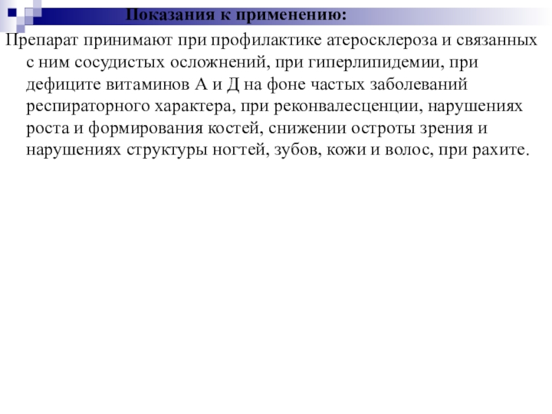 Препарат принимают при профилактике атеросклероза и связанных с ним сосудистых осложнений, при гиперлипидемии, при дефиците витаминов А и Д на фоне частых заболеваний респираторного характера, при реконвалесценции, нарушениях роста и формирования костей, снижении остроты зрения и нарушениях структуры ногтей, зубов, кожи и волос, при рахите.