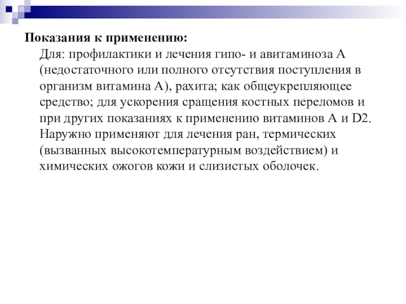 или полного отсутствия поступления в организм витамина А), рахита; как общеукрепляющее средство; для ускорения сращения костных переломов и при других показаниях к применению витаминов А и D2. Наружно применяют для лечения ран, термических (вызванных высокотемпературным воздействием) и химических ожогов кожи и слизистых оболочек.