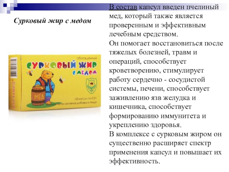 В комплексе с сурковым жиром он существенно расширяет спектр применения капсул и повышает их эффективность.