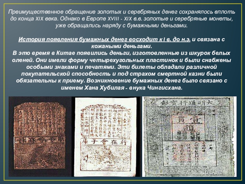 В это время в Китае появились деньги, изготовленные из шкурок белых оленей. Они имели форму четырехугольных пластинок и были снабжены особыми знаками и печатями. Эти билеты обладали различной покупательской способность и под страхом смертной казни были обязательны к приему. Возникновение бумажных денег было связано с именем Хана Хубилая - внука Чингисхана.
