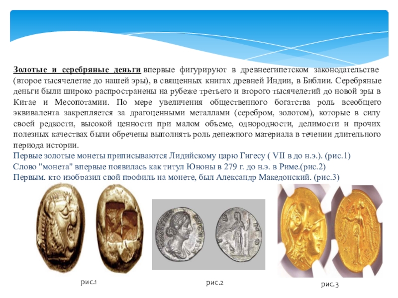 Слайд 6Золотые и серебряные деньги впервые фигурируют в древнеегипетском законодательстве (второе тысячелетие до