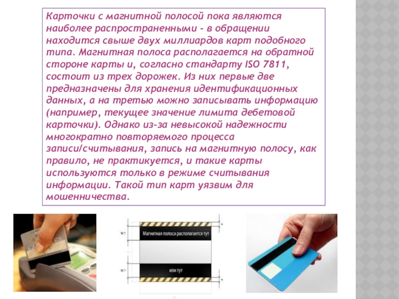 свыше двух миллиардов карт подобного типа. Магнитная полоса располагается на обратной стороне карты и, согласно стандарту ISO 7811, состоит из трех дорожек. Из них первые две предназначены для хранения идентификационных данных, а на третью можно записывать информацию (например, текущее значение лимита дебетовой карточки). Однако из-за невысокой надежности многократно повторяемого процесса записи/считывания, запись на магнитную полосу, как правило, не практикуется, и такие карты используются только в режиме считывания информации. Такой тип карт уязвим для мошенничества.