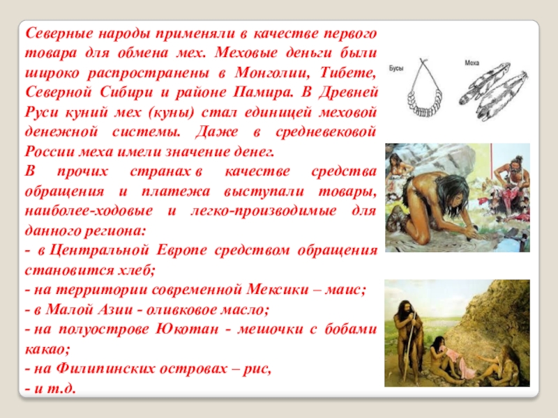 Слайд 5Северные народы применяли в качестве первого товара для обмена мех. Меховые