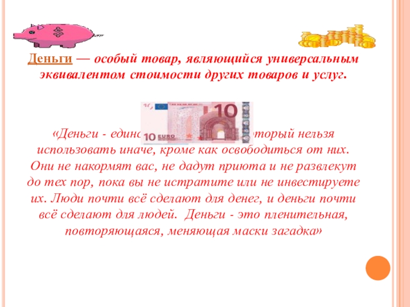 Деньги — особый товар, являющийся универсальным эквивалентом стоимости других товаров и услуг.