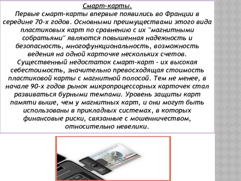 Первые смарт-карты впервые появились во Франции в середине 70-х годов. Основными преимуществами этого