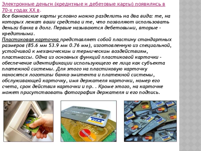 Слайд 11Электронные деньги (кредитные и дебетовые карты) появились в 70-х годах XX в.