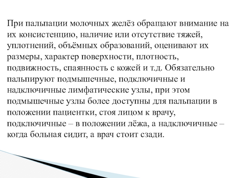 отсутствие тяжей, уплотнений, объёмных образований, оценивают их размеры, характер поверхности, плотность, подвижность, спаянность с кожей и т.д. Обязательно пальпируют подмышечные, подключичные и надключичные лимфатические узлы, при этом подмышечные узлы более доступны для пальпации в положении пациентки, стоя лицом к врачу, подключичные – в положении лёжа, а надключичные – когда больная сидит, а врач стоит сзади.