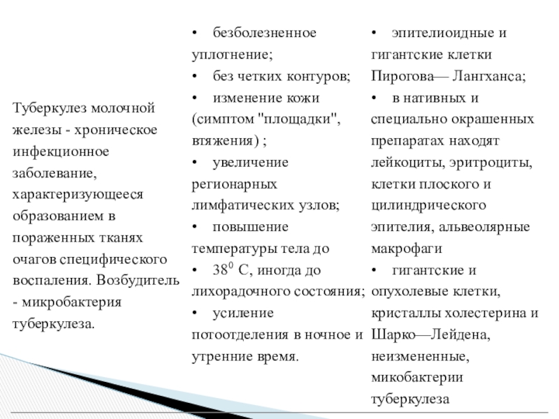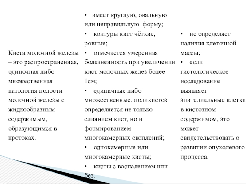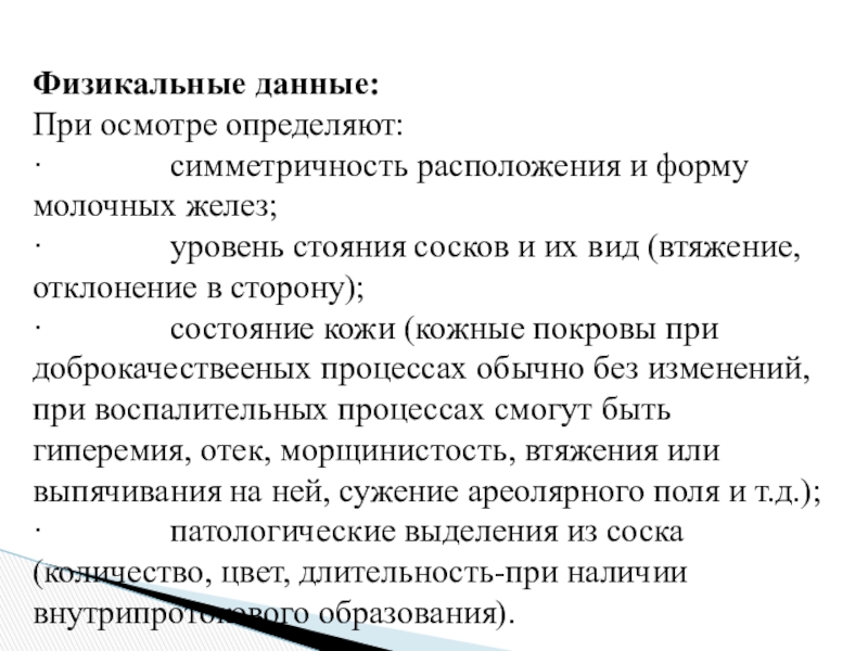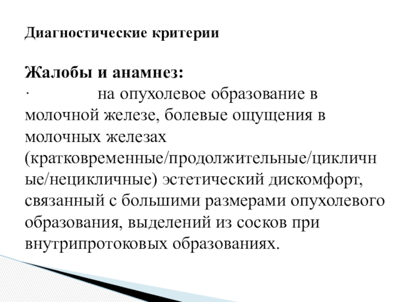 ощущения в молочных железах (кратковременные/продолжительные/цикличные/нецикличные) эстетический дискомфорт, связанный с большими размерами опухолевого образования, выделений из сосков при внутрипротоковых образованиях.