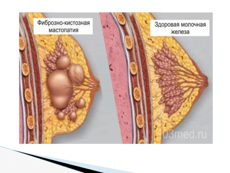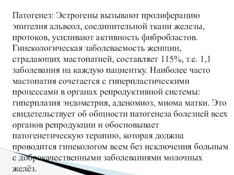 Слайд 7Патогенез: Эстрогены вызывают пролиферацию эпителия альвеол, соединительной ткани железы, протоков, усиливают