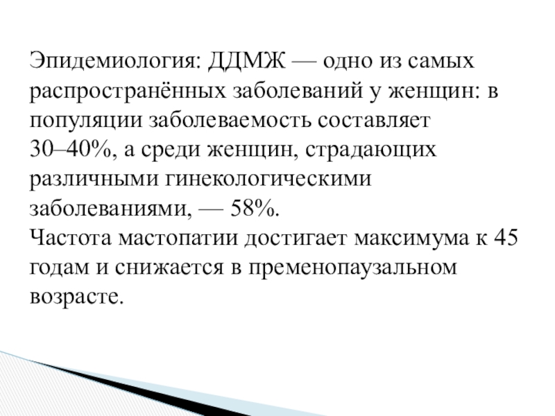Слайд 5Эпидемиология: ДДМЖ — одно из самых распространённых заболеваний у женщин: в