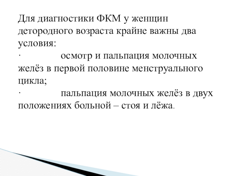 Слайд 12Для диагностики ФКМ у женщин детородного возраста крайне важны два условия: