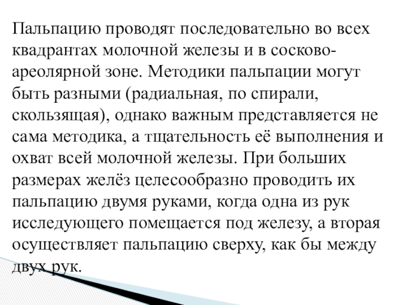 зоне. Методики пальпации могут быть разными (радиальная, по спирали, скользящая), однако важным представляется не сама методика, а тщательность её выполнения и охват всей молочной железы. При больших размерах желёз целесообразно проводить их пальпацию двумя руками, когда одна из рук исследующего помещается под железу, а вторая осуществляет пальпацию сверху, как бы между двух рук.