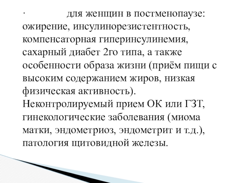 Слайд 10· для женщин в постменопаузе: ожирение, инсулинорезистентность, компенсаторная гиперинсулинемия, сахарный диабет