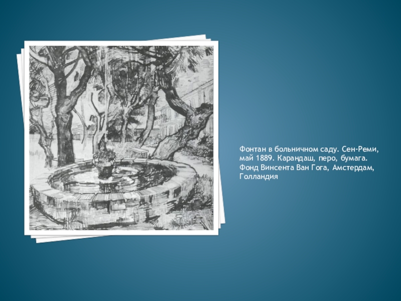 Слайд 19Фонтан в больничном саду. Сен-Реми, май 1889. Карандаш, перо, бумага.