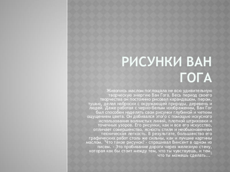 Гога. Весь период своего творчества он постоянно рисовал карандашом, пером, тушью, делая наброски с окружающей природы, деревень и людей. Даже работая с черно-белым изображеним, Ван Гог был способен наделять свои рисунки глубиной и четким ощущением цвета. Он добивался этого с помощью искусного использования волнистых линий, плотной штриховки и точечных узоров. Его рисунки, как и все его искусство, отличает совершенство, ясность стиля и необыкновенная техническая легкость. В результате, большинство его графических работ столь же сильны, как и лучшие картины маслом. "Что такое рисунок? - спрашивал Винсент в одном из писем. - Это пробивание дороги через железную стену, которая как бы стоит между тем, что ты чувствуешь, и тем, что ты можешь сделать..."
