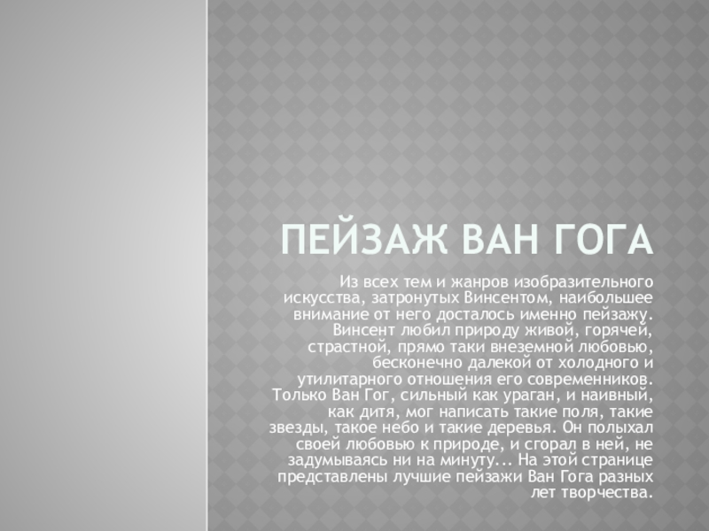наибольшее внимание от него досталось именно пейзажу. Винсент любил природу живой, горячей, страстной, прямо таки внеземной любовью, бесконечно далекой от холодного и утилитарного отношения его современников. Только Ван Гог, сильный как ураган, и наивный, как дитя, мог написать такие поля, такие звезды, такое небо и такие деревья. Он полыхал своей любовью к природе, и сгорал в ней, не задумываясь ни на минуту... На этой странице представлены лучшие пейзажи Ван Гога разных лет творчества.
