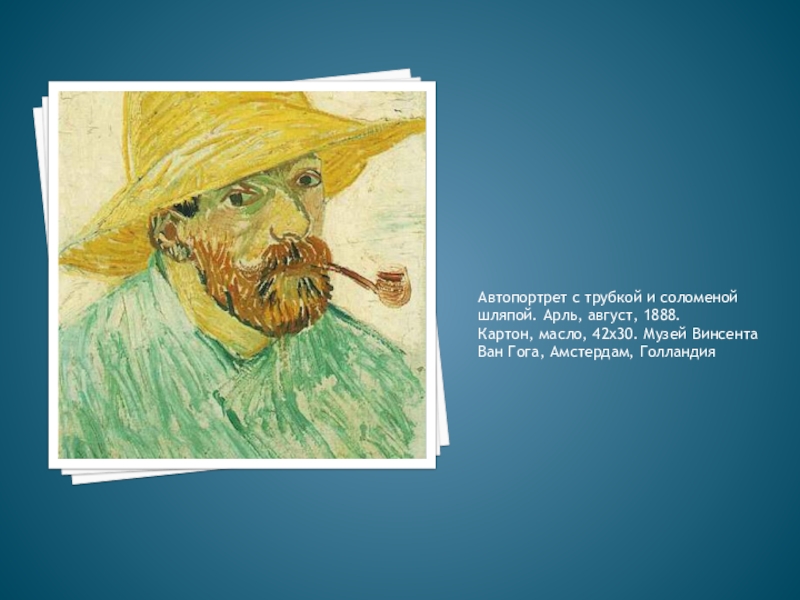Слайд 12Автопортрет с трубкой и соломеной шляпой. Арль, август, 1888.