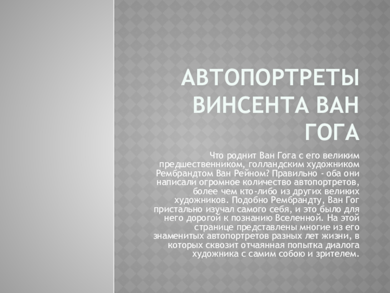 голландским художником Рембрандтом Ван Рейном? Правильно - оба они написали огромное количество автопортретов, более чем кто-либо из других великих художников. Подобно Рембрандту, Ван Гог пристально изучал самого себя, и это было для него дорогой к познанию Вселенной. На этой странице представлены многие из его знаменитых автопортретов разных лет жизни, в которых сквозит отчаянная попытка диалога художника с самим собою и зрителем.