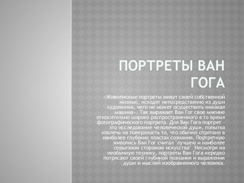 души художника, чего не может осуществить никакая машина». Так выражает Ван Гог свое мнение относительно широко распространенного в то время фотографического портрета. Для Ван Гога портрет - это исследование человеческой души, попытка извлечь на поверхность то, что обычно спрятано в наиболее глубоких пластах сознания. Портретную живопись Ван Гог считал "лучшею и наиболее серьезною стороною искусства". Несмотря на необычную технику, портреты Ван Гога нередко потрясают своей глубиной познания и выражения души и мыслей изображенного человека.