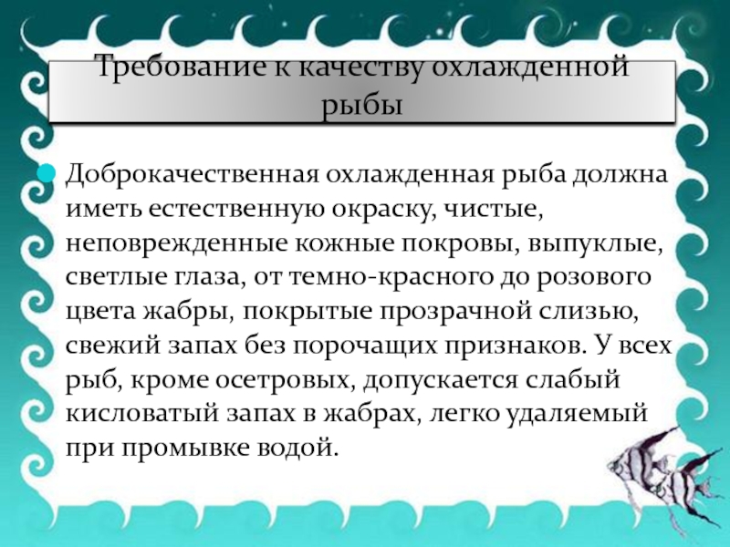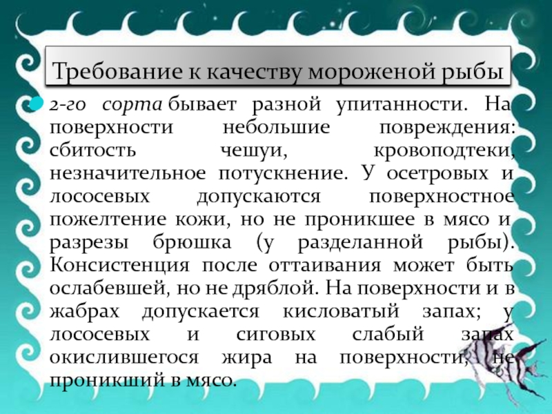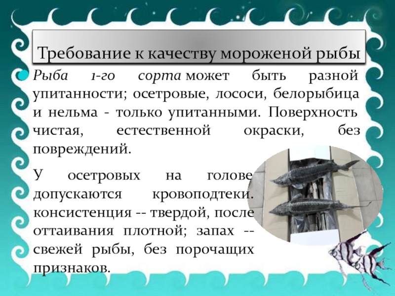 У осетровых на голове допускаются кровоподтеки. консистенция -- твердой, после оттаивания плотной; запах -- свежей рыбы, без порочащих признаков.