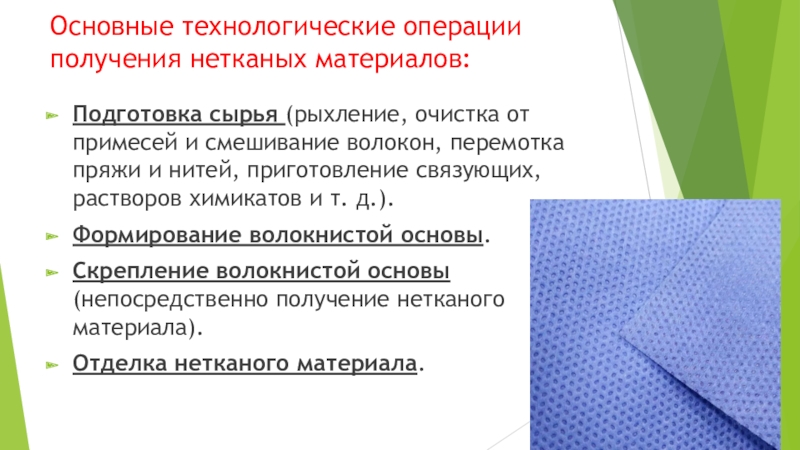 Слайд 4Основные технологические операции получения нетканых материалов:
