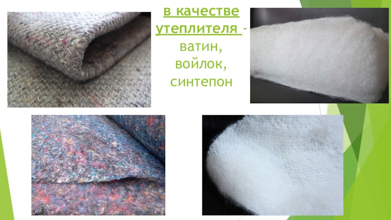 Слайд 6в качестве утеплителя - ватин, войлок, синтепон
