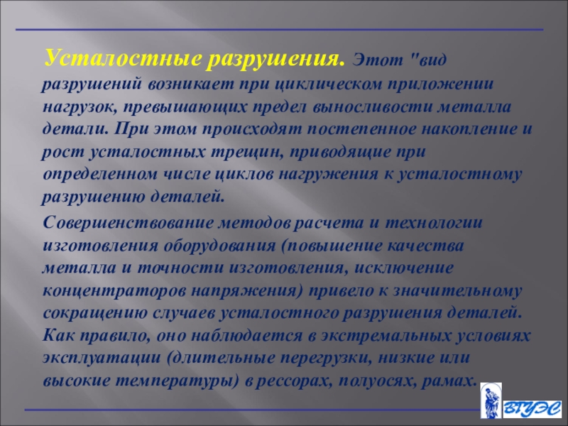 Совершенствование методов расчета и технологии изготовления оборудования (повышение качества металла и точности изготовления, исключение концентраторов напряжения) привело к значительному сокращению случаев усталостного разрушения деталей. Как правило, оно наблюдается в экстремальных условиях эксплуатации (длительные перегрузки, низкие или высокие температуры) в рессорах, полуосях, рамах.