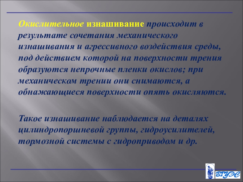 Слайд 10Окислительное изнашивание происходит в результате сочетания механического изнашивания и агрессивного воздействия