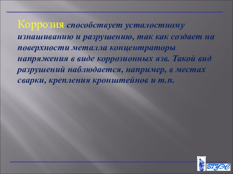 Слайд 15Коррозия способствует усталостному изнашиванию и разрушению, так как создает на поверхности