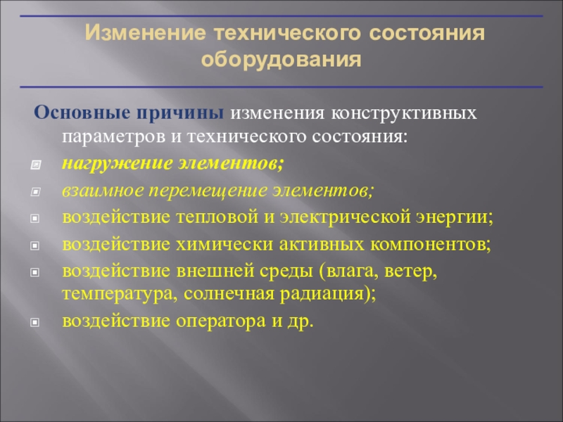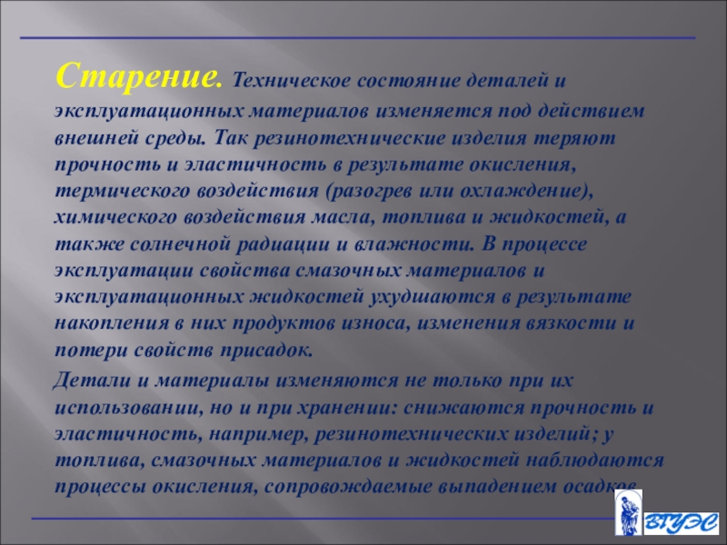 Слайд 16Старение. Техническое состояние деталей и эксплуатационных материалов изменяется под действием внешней