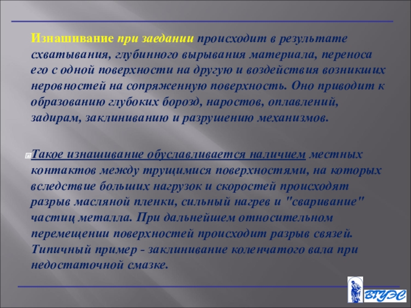 Такое изнашивание обуславливается наличием местных контактов между трущимися поверхностями, на которых вследствие больших нагрузок и скоростей происходят разрыв масляной пленки, сильный нагрев и "сваривание" частиц металла. При дальнейшем относительном перемещении поверхностей происходит разрыв связей. Типичный пример - заклинивание коленчатого вала при недостаточной смазке.
