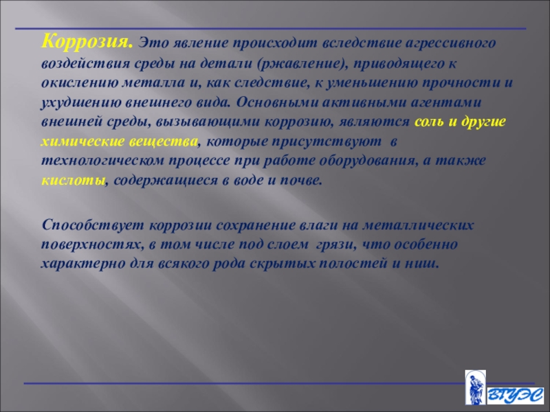 Слайд 14Коррозия. Это явление происходит вследствие агрессивного воздействия среды на детали (ржавление),