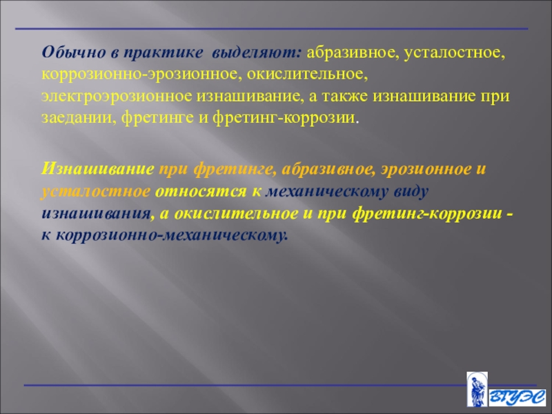Слайд 6Обычно в практике выделяют: абразивное, усталостное, коррозионно-эрозионное, окислительное, электроэрозионное изнашивание, а