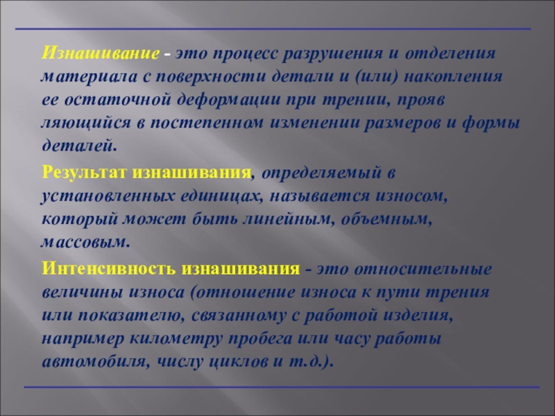 и (или) накопления ее остаточной деформации при трении, проявляющийся в постепенном изменении размеров и формы деталей.