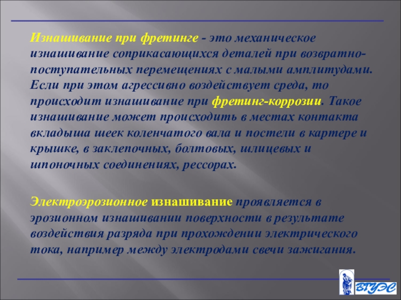 Слайд 11Изнашивание при фретинге - это механическое изнашивание соприкасающихся деталей при возвратно-поступательных