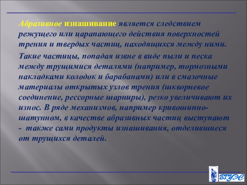 Слайд 7Абразивное изнашивание является следствием режущего или царапающего действия поверхностей трения и