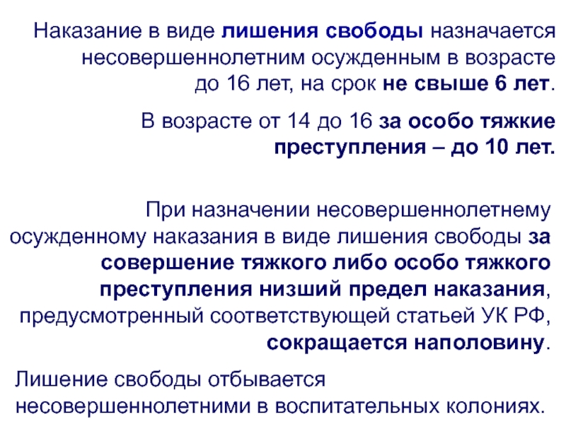 При назначении несовершеннолетнему осужденному наказания в виде лишения свободы за совершение тяжкого либо особо тяжкого преступления низший предел наказания, предусмотренный соответствующей статьей УК РФ, сокращается наполовину.