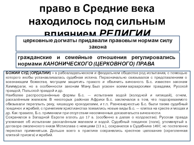 БОЖИЙ СУД (ОРДАЛИИ) – в рабовладельческом и феодальном обществе род испытания, с помощью которого якобы устанавливалась судебная истина. Первоначально связывался с представлением о всезнающем божестве, могущем защитить правого и обвинить виновного. Б.с. известен законам Хаммурапи, но в особенности законам Ману. Был усвоен всеми варварскими правдами, Русской правдой, Польской правдой и др.