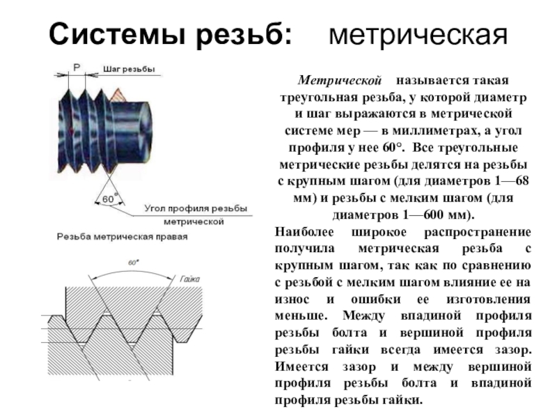 Метрической называется такая треугольная резьба, у которой диаметр и шаг выражаются в метрической системе мер — в миллиметрах, а угол профиля у нее 60°. Все треугольные метрические резьбы делятся на резьбы с крупным шагом (для диаметров 1—68 мм) и резьбы с мелким шагом (для диаметров 1—600 мм).