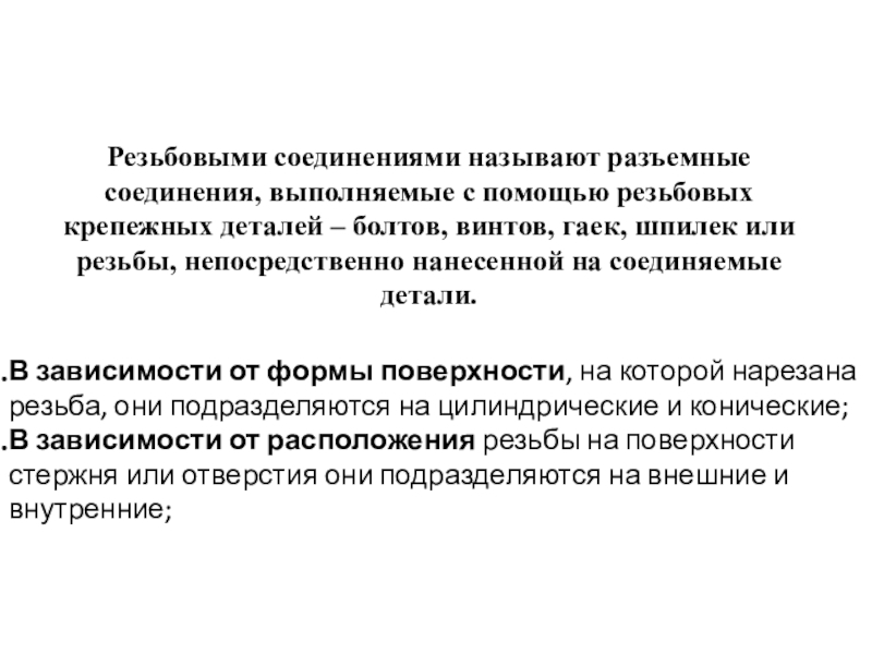В зависимости от формы поверхности, на которой нарезана резьба, они подразделяются на цилиндрические и конические;