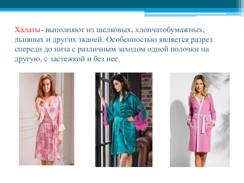 Халаты- выполняют из шелковых, хлопчатобумажных, льняных и других тканей. Особенностью является разрез спереди до низа с различным