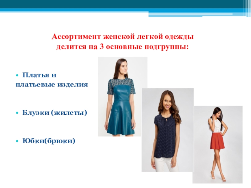Ассортимент женской легкой одежды делится на 3 основные подгруппы:Платья и платьевые изделияБлузки (жилеты)Юбки(брюки)