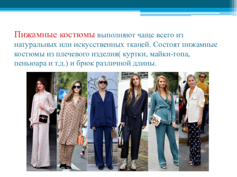Слайд 9Пижамные костюмы выполняют чаще всего из натуральных или искусственных тканей. Состоят
