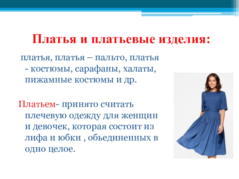 Платьем- принято считать плечевую одежду для женщин и девочек, которая состоит из лифа и юбки , обьединенных в одно целое.