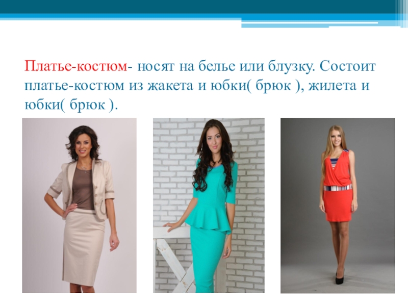 Слайд 6Платье-костюм- носят на белье или блузку. Состоит платье-костюм из жакета и