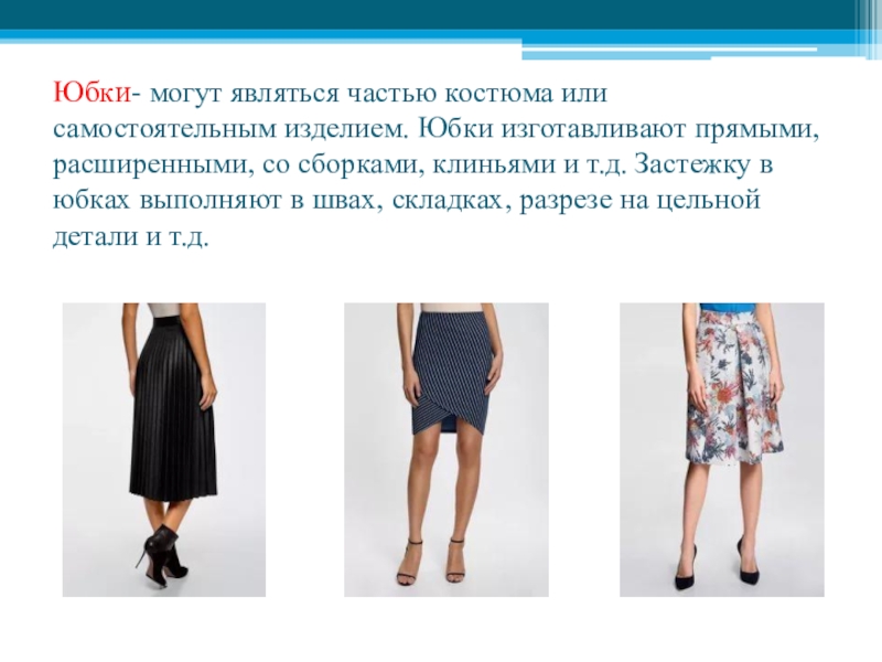 Слайд 11Юбки- могут являться частью костюма или самостоятельным изделием. Юбки изготавливают прямыми,