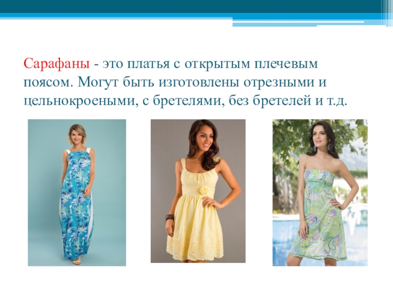 Слайд 7Сарафаны - это платья с открытым плечевым поясом. Могут быть изготовлены