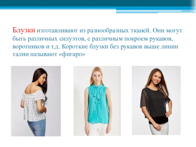 различным покроем рукавов, воротников и т.д. Короткие блузки без рукавов выше линии талии называют «фигаро»